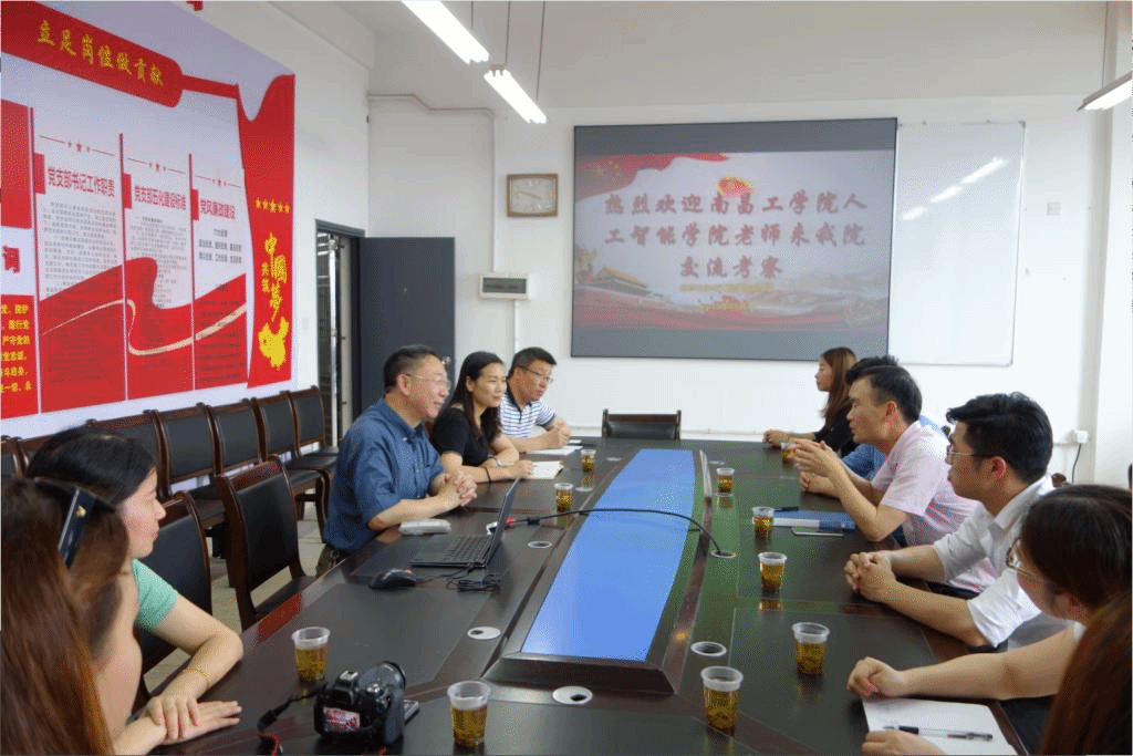 2019年5月24日下午,南昌工学院人工智能学院聂宗省书记一行八位教师来我院考察交流。我院党总支王杰文书记、易利副书记、王建军副院长、田祖伟副院长及党政办主任曾玢石老师在玉衡楼北栋407会议室热情接待了来访人员。