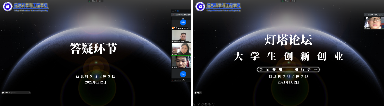 1月2日下午2点30至5点,我院在腾讯会议APP开展线上“灯塔论坛”之“大学生创新创业”专场。学院党总支书记王杰文、副书记成夏炎、学工办主任关红儒和学工办李荣敬出席了会议,会议邀请了我院的优秀校友龚宣运、贺诗娉、刘石奇进行经验分享和交流座谈。