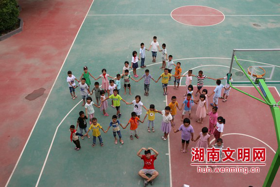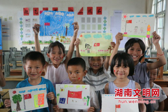 “五星红旗”美术课上孩子们展示手绘国旗作品合影留念。图片来源:湖南文明网 通讯员 易青山 摄 同学们手牵手排列出一颗色彩斑斓的“五角星”,颗颗童心跟党走。图片来源:湖南文明网 通讯员 李玉莉 摄