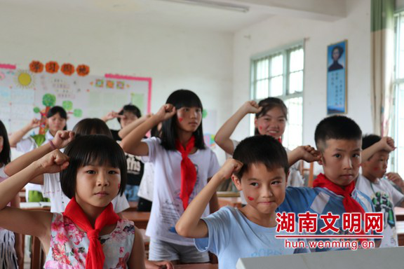 握紧小小的拳头,表达自己保卫母亲河的决心。图片来源:湖南文明网 通讯员 高顺年 摄 湖南第一师范学院信息科学与工程学院师生18人组成“新时代E路行”教育帮扶关爱团赴郴州市汝城县文明瑶族乡第一片小学校,于7月8日至7月21日开展支教、调研实践活动。 为庆祝中国共产党成立97周年、纪念改革开放40周年,深化农村儿童思想道德建设,帮助其“扣好人生的第一粒扣子”,新航向梦之队于7月13日至7月21日开展了以“童心向党”为主题的系列课程,涵盖“五星红旗”美术课、“红旗飘扬”手工课、“红色少年”舞蹈课、“红星闪闪”音乐课和“歌颂母亲河”普通话课引导农村儿童知党爱党、听党话跟党走,努力成长为担当民族复兴大任的时代新人。 “五星红旗”美术课和“红旗飘扬”手工课上,队员为孩子们讲解国旗故事,带领大家一起手绘国旗,让他们领会五星红旗背后的意义,将革命传统文化搬进课堂。 “红色少年”舞蹈课和“红星闪闪”音乐课上,队员介绍了五星红旗的诞生和含义,带领孩子们用舞蹈动作和歌声表达自己对“五星红旗”的崇敬之情,在孩子们幼小的心灵上种下一棵爱旗爱党的种子引导孩子们爱党、敬党。 在普通话课上,队员带领孩子们声情并茂的朗诵诗歌《母亲河,红领巾为你歌唱》,同学们用清晰的语言,响亮的声音,加上老师引入的动作,把诗歌有感情地表达出来,准确的传达诗歌的思想内容。 此次红色主题课程活动,新航向梦之队队员们围绕“童心向党”,紧扣爱党爱国爱社会主义主题,通过美术、手工、舞蹈、音乐和普通话课等丰富多彩的红色主题课程,寓教于乐引导农村儿童德、智、体、美、劳全面发展,培养农村儿童心向党、跟党走的坚定信念。 |
