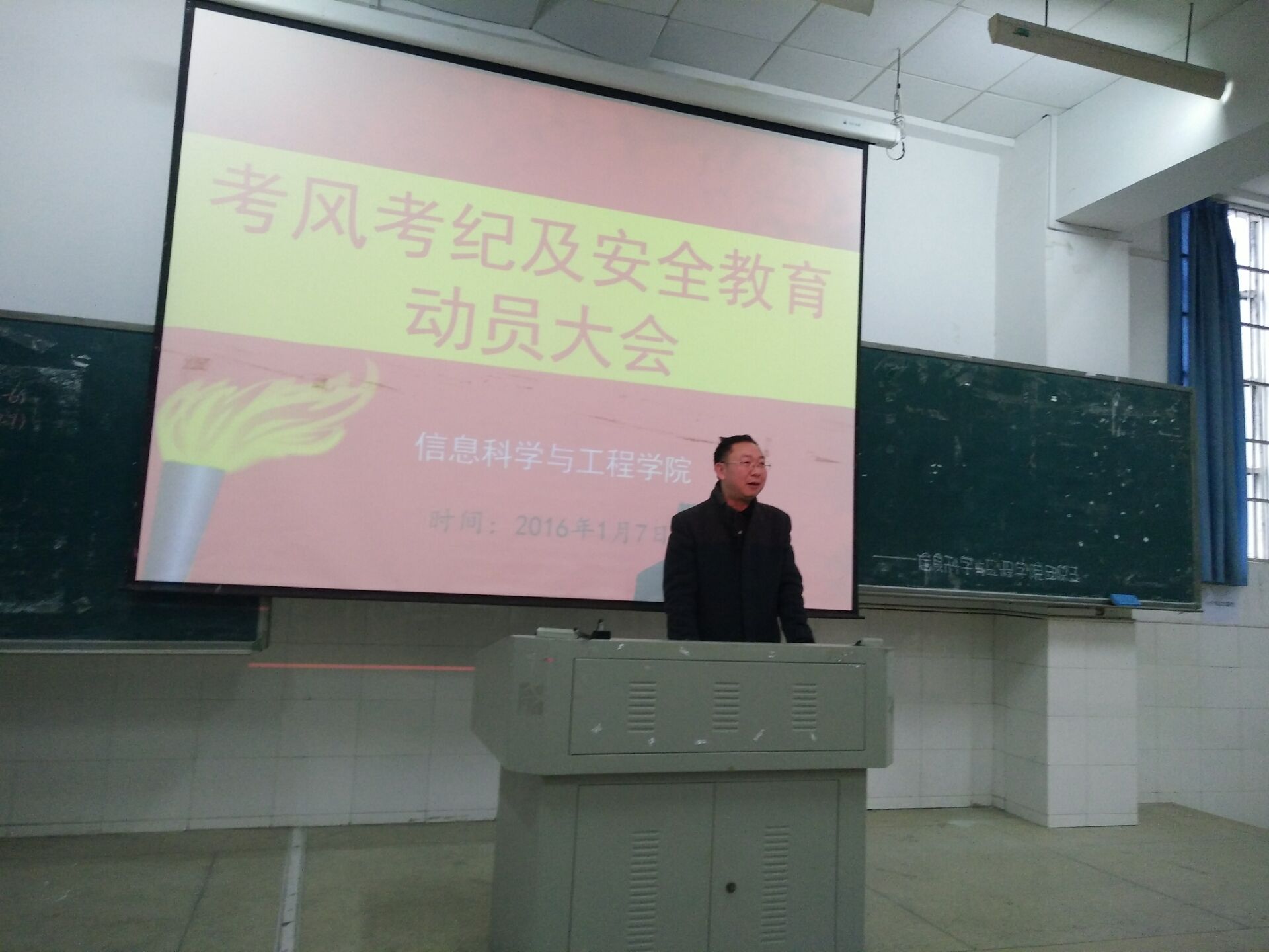 (通讯员 肖亚丽 易利)2016年1月7日中午12点30分,信息科学与工程与学院考风考纪及安全教育动员大会在实验楼C栋101教室隆重举行。信息科学与工程学院党总支书记王杰文、党总支副书记罗祥云、副院长田祖伟、院团总支书记易利、院学工办关红儒老师、李豪杰老师、院学生干部、各班班干部代表及我院各班级寝室长共计400余人参加了本次大会。本次会议由易利主持。