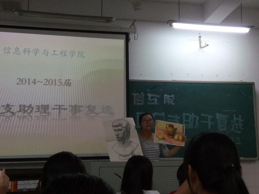 (通讯员 吴玲峰 易利) 为了吸收更多有才能的新成员,为信工院团总支注入新的活力,2014年10月10日晚6点于理科楼C栋301、302教室如期举行助干招新复选活动。信工院党总支书记王杰文、团总支书记易利、2014届新生辅导员李豪杰应邀出席了本次招新活动。