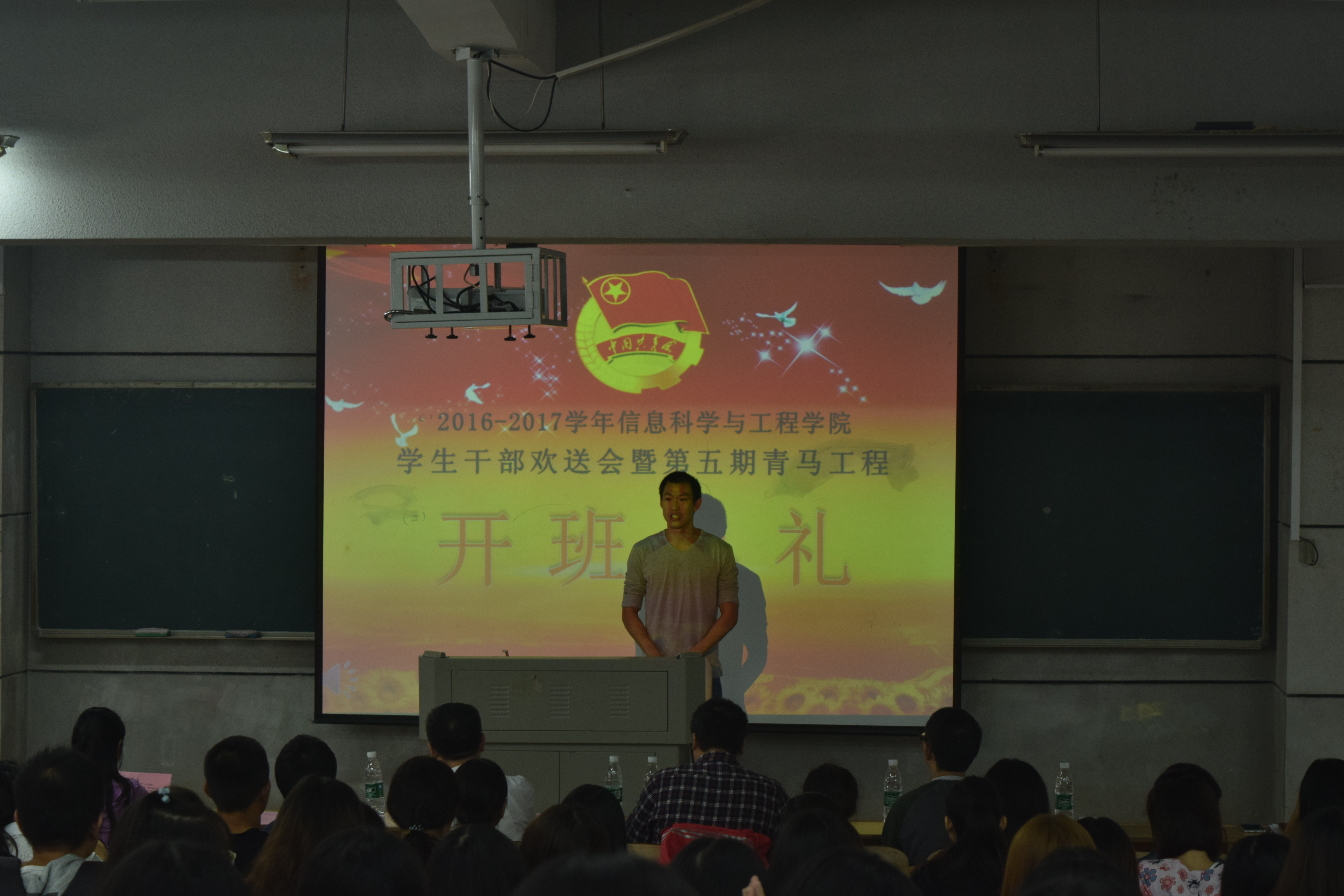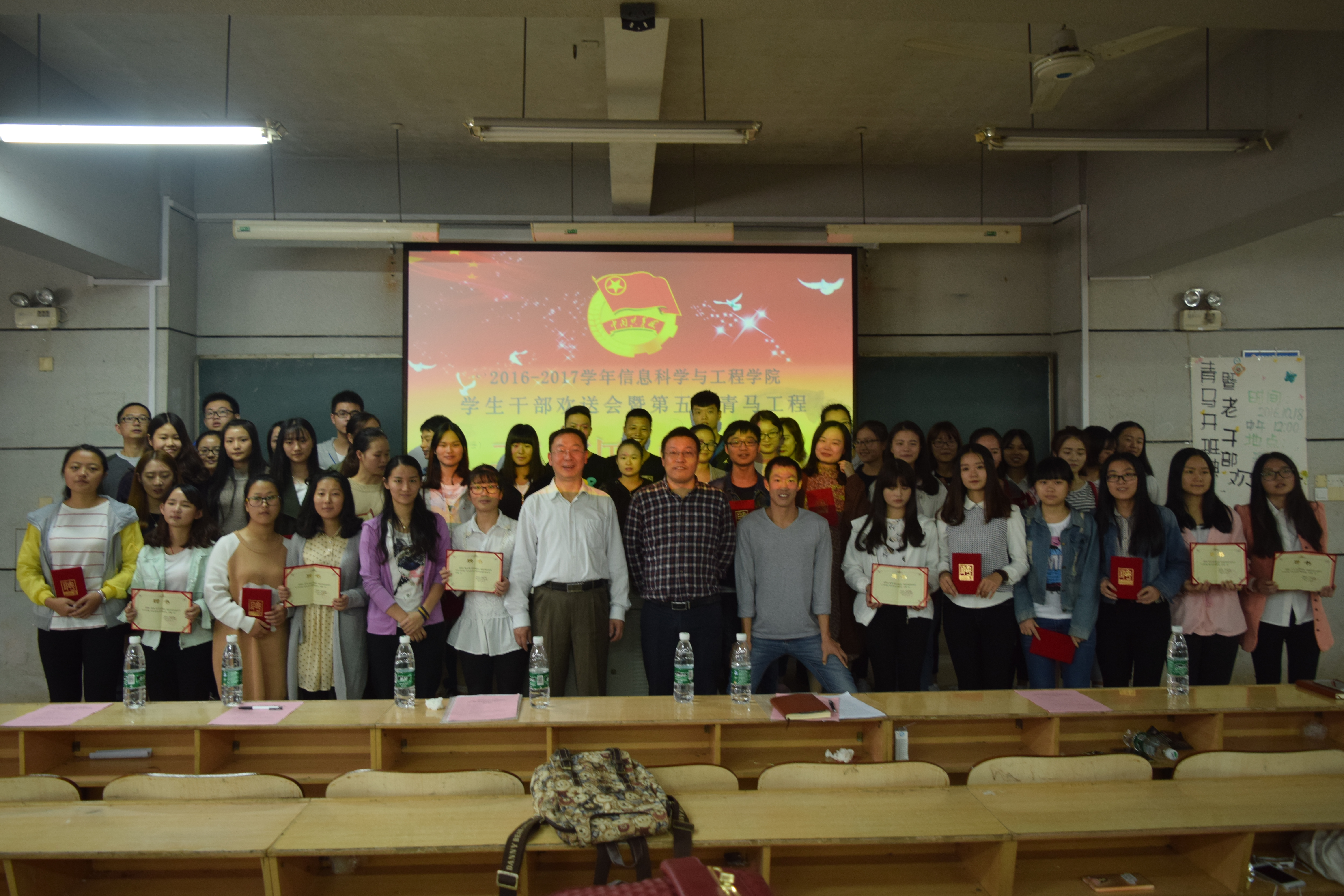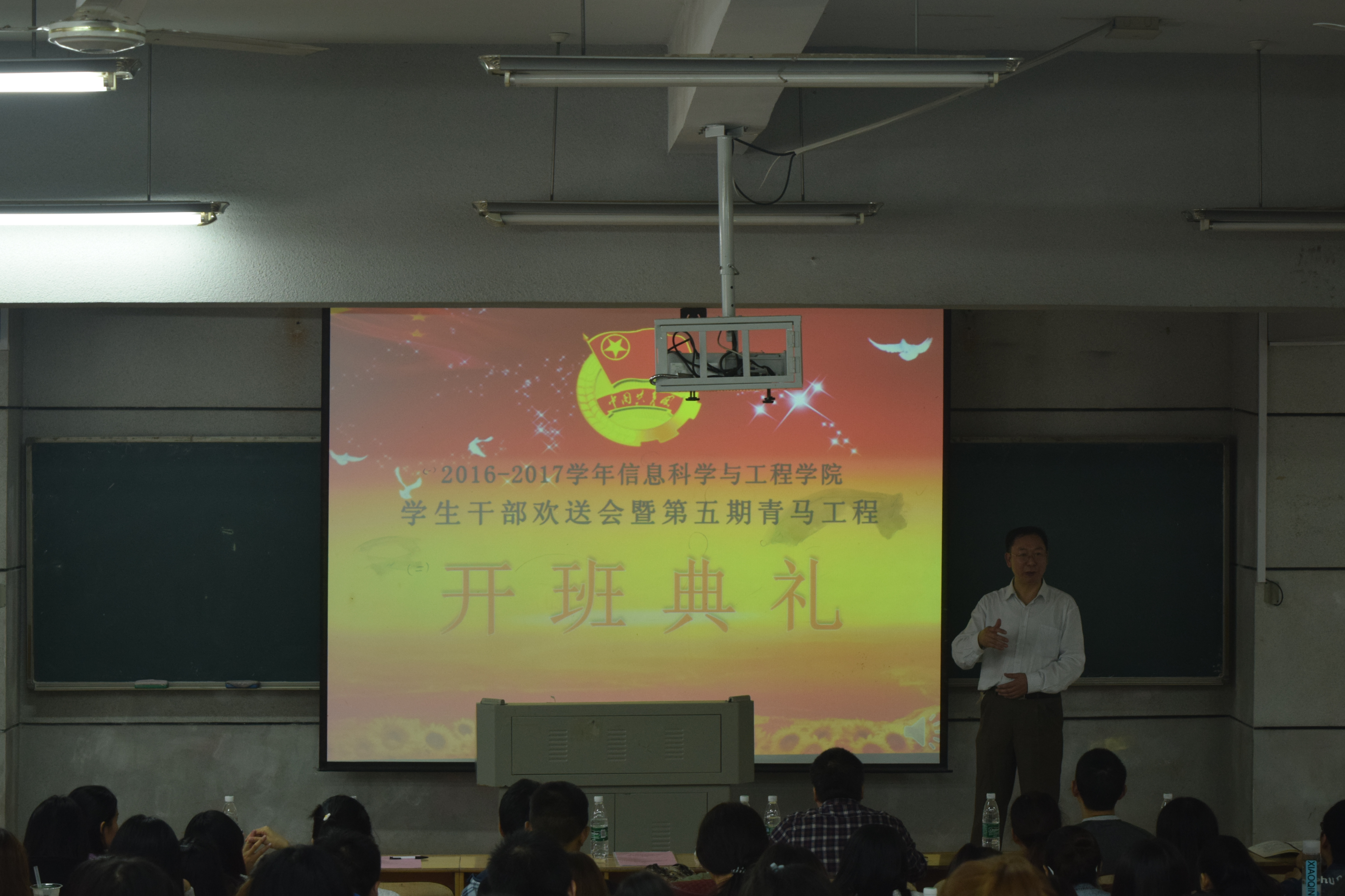 (通讯员 袁思思 龙紫荆) 2016年10月18日中午12点30分,信息科学与工程学院2015-2016届学生干部欢送会暨青马工程骨干培训开班典礼在理科楼b栋101教室隆重举行。信息科学与工程学院党总支书记王杰文教授,副院长田祖伟教授,学工办关红儒、唐瑞鸿老师,2015—2016届学生干部、2016—2017届学生干部及助理干事共计180余人出席了典礼。典礼由团总支书记李豪杰主持。