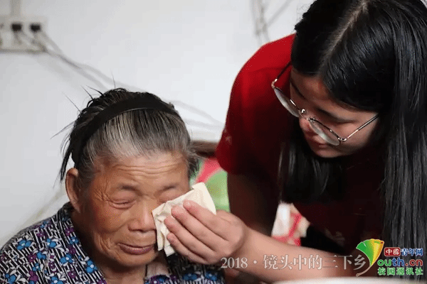 次日上午队员们到达两位老人的家,入目是一扇木制的、摇摇晃晃的、有些年头了的小门、一盏昏暗的灯、一堆尚未收拾好的碗筷。看到家门口来人了,驼背的老奶奶手摸着膝盖急急地迎了出来,忙进忙出地搬凳子催促着队员们坐下来,并拿出了平时舍不得吃、放置已久的大西瓜招待,生怕怠慢了前来探望的客人们。队员们说明来意后,只见老奶奶眼睛里噙满了泪水,紧拽着新航向·梦之队队员的手,嘴里不停地说着“谢谢,谢谢你们能来看我们”,坐在床上的老爷爷也一直目不转睛地盯着这群突然到访的客人,生怕他们忽然从眼前溜走了。