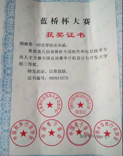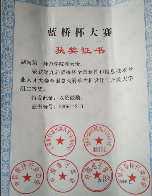 近日,第九届蓝桥杯全国软件和信息技术专业人才大赛全国总决赛在北京落下帷幕。来自北京大学、清华大学等1200多所高校的5000余名各省市自治区一等奖选手参加了全国总决赛。湖南第一师范学院信息科学与工程学院学生陈天奇在傅红普教授指导下荣获单片机设计与开发大学组二等奖、宋亚威在马重明教授的指导下荣获单片机设计与开发大学组三等奖。