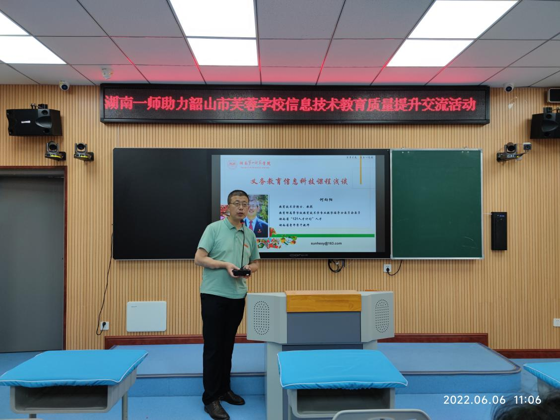 为提升芙蓉学校教育教学质量,实现城乡教育均衡发展,充分发挥我校在基础教育领域的引领示范作用,实现优质资源共享,2022年6月6日,BETVLCTOR伟德在线副院长何向阳带领由教育技术学专业教学论团队成员、长沙市天心区青园小学教师龚宣运、湖南一师第一附属小学教师曹向荣组成的教育技术学帮扶团队,前往韶山市芙蓉学校开展信息技术教育质量提升交流研讨活动。此次活动由韶山市芙蓉学校校长李冬文主持,芙蓉学校全体行政、综艺组全体教师,韶山市各小学信息技术教师代表等参加了此次活动。
