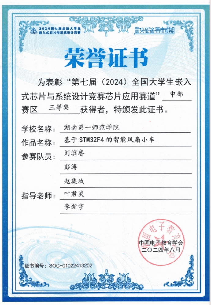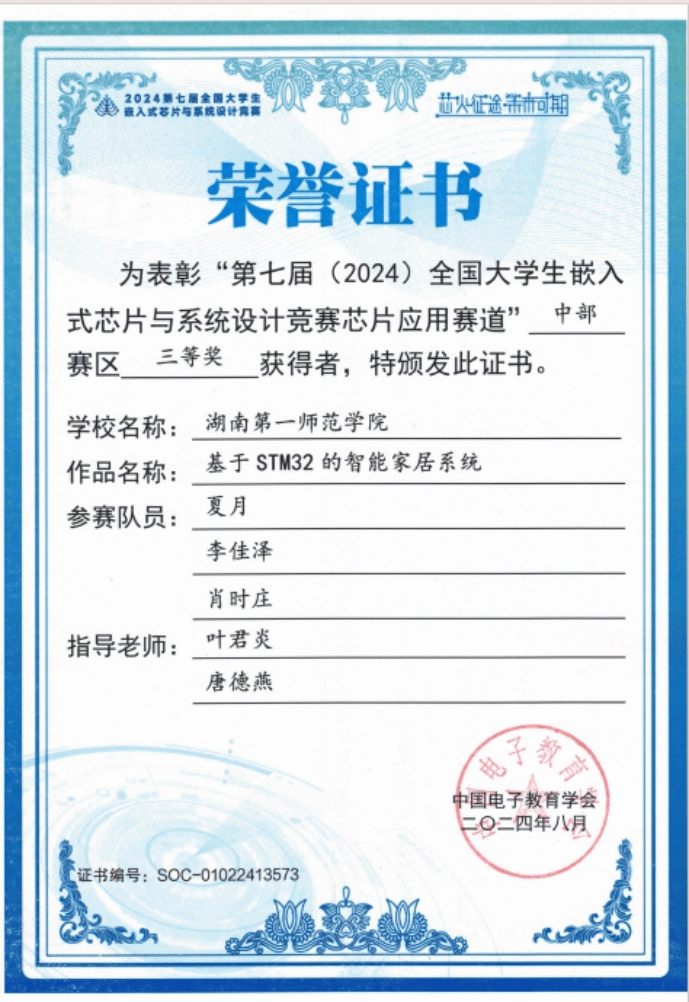 第七届(2024)全国大学生嵌入式芯片与系统设计竞赛圆满收官。该竞赛由中国电子学会主办、东南大学承办,是面向全国高校学生的权威赛事,已连续 4 年入选 “全国普通高校大学生竞赛排行榜”。此次比赛竞争激烈,我院首次组队参赛,在指导老师叶君炎的精心指导下,参赛学生凭借扎实专业知识与拼搏精神,于中部赛区荣获三等奖 3 项。