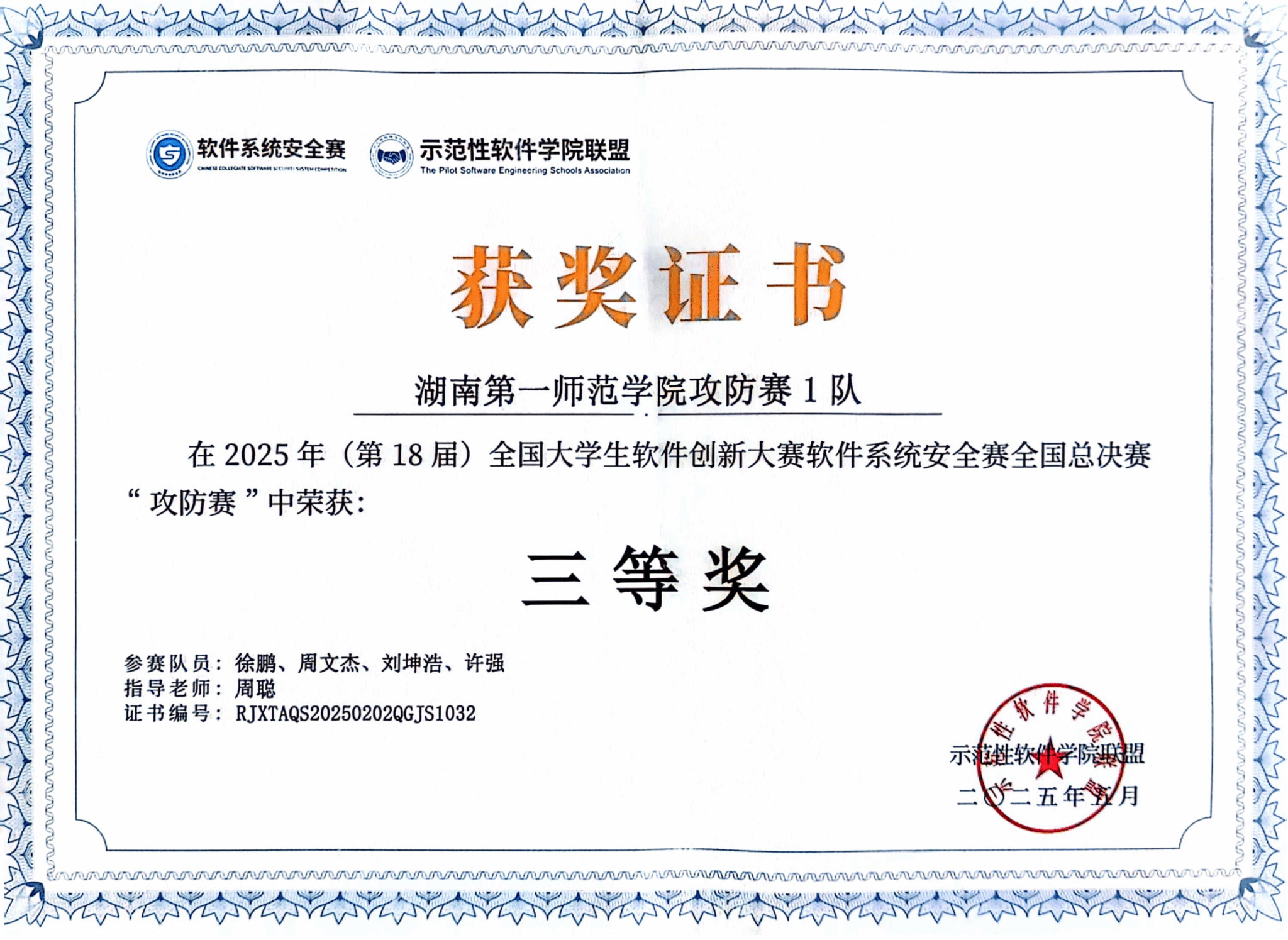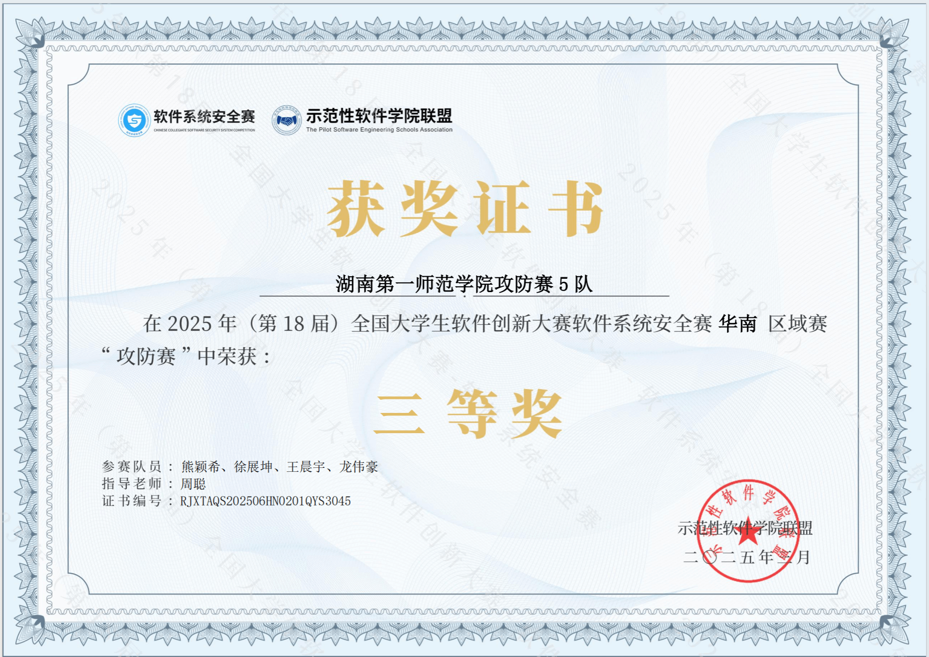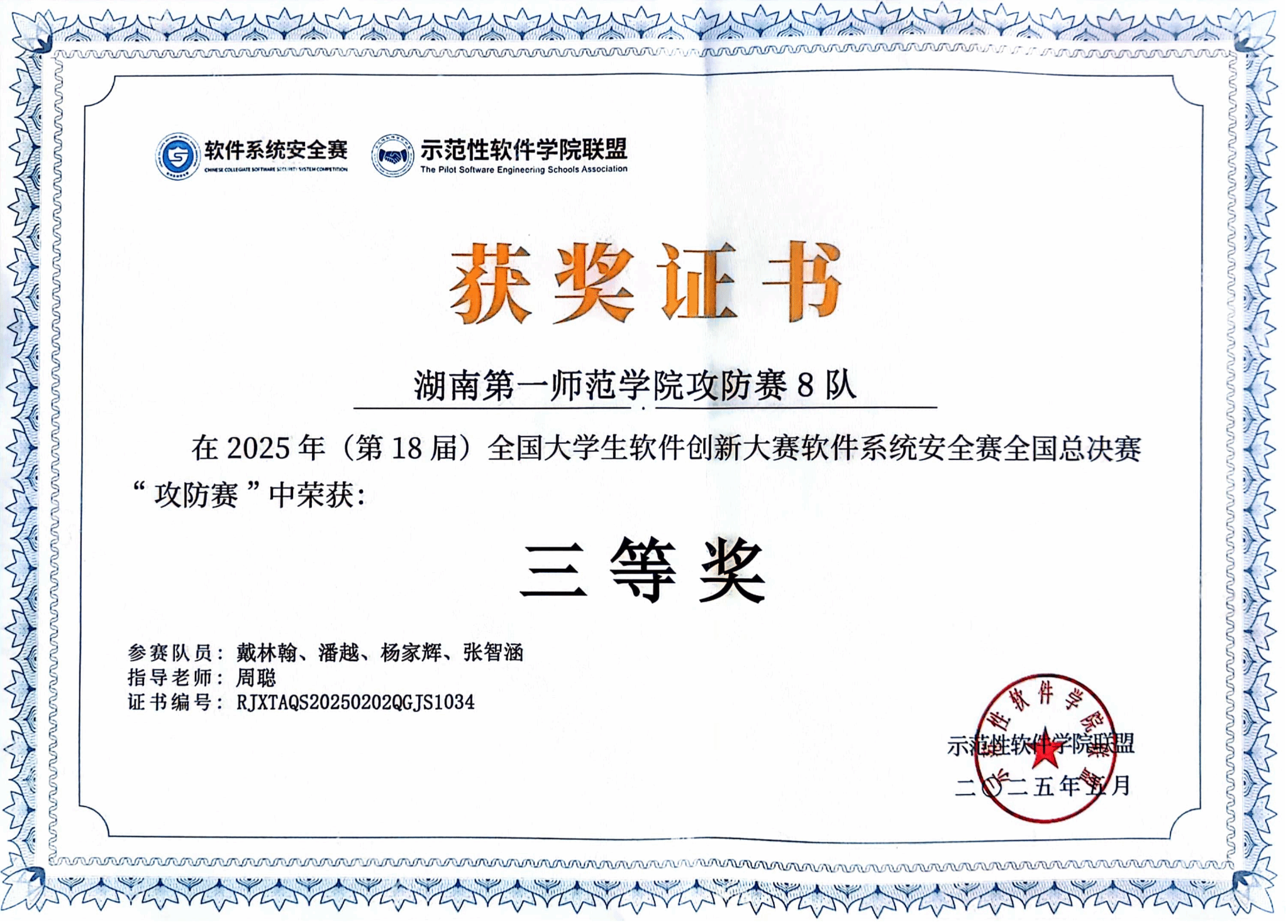 第18届全国大学生软件创新大赛软件系统安全赛全国总决赛于2025年5月18日在湖南大学圆满落幕。湖南高校共有18支团队获奖。其中我院的2支参赛团队荣获攻防赛三等奖,实现了网安竞赛团队在国家级赛事中获奖的突破。在区域赛阶段,我院参赛团队表现出色,斩获一等奖2项、二等奖1项、三等奖3项,位居华南赛区前列。