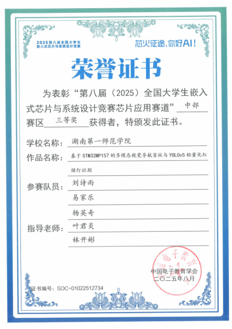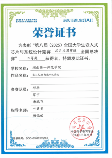 第八届(2025)全国大学生嵌入式芯片与系统设计竞赛评审结果公布,我院学生团队荣获全国二等奖1项、省级三等奖1项。其中,由唐鹏飞、蔡宇、邱季同学组成的参赛队获全国二等奖,实现了我院在该项赛事中国奖级别的历史性突破;由刘诗雨、易家乐、杨英奇同学组成的队伍获省级三等奖。