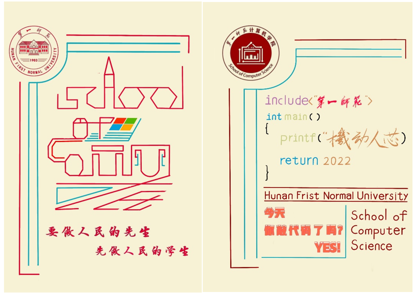 大赛收到原创作品21份,五份作品从中脱颖而出。其中,21级计科3班张任也同学以校徽、校训为主体元素,并巧妙融合C语言代码设计出的帆布包,简洁大方、创意新颖;21级881教技班刘靓同学设计的穿着太空服的智能机器人,生动活泼、富有趣味;21级计科3班李颜林同学则借以ASCII、Python、C、JAVA等多种编程语言为元素设计出的徽章,着重突出了我院的课程特色;21计科1班刘博毓同学与21教技1班罗雅婕均选择以我校标志性建筑——钟楼为背景元素,设计出了包括明信片在内等一系列精致美观的学院周边。