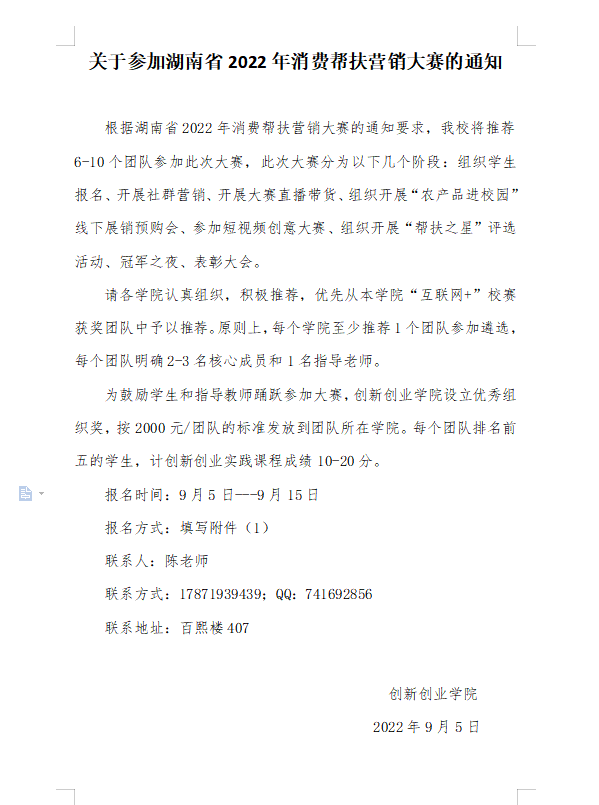现将校创新创业学院《关于参加湖南省2022年消费帮扶营销大赛的通知》转发,请按照文件要求,广泛宣传,积极动员学生参加大赛,具体参赛要求见附件1。请各班实践委员于9月13日下午18:00前将推报材料(见附件1)纸质版、电子版以班级名称命名上交院创新创业与就业服务部杨同学(QQ:2084222961)。院创新创业与就业服务部于次日交至学院学工办(百熙楼127-5)。
