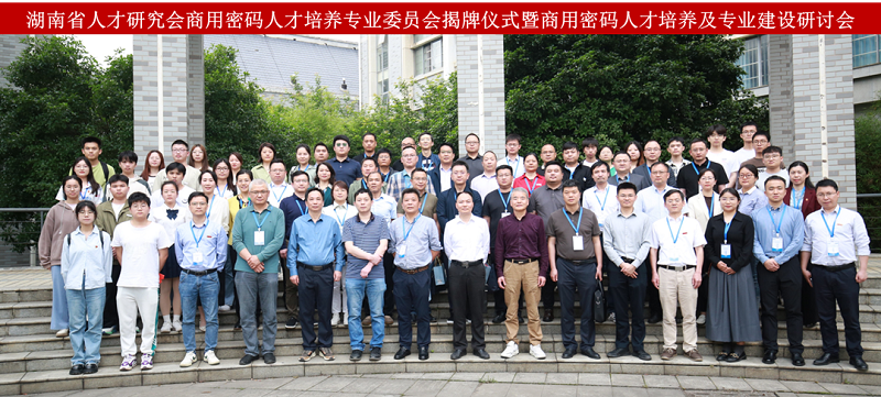 5月10日上午,湖南省人才研究会商用密码人才培养专业委员会揭牌仪式暨商用密码人才培养及专业建设研讨会在我校举办。我校党委书记罗成翼,湖南省国家密码管理局副局长吴运华,湖南省人才研究会会长杨治平,长沙市委办公室商用密码管理处处长黄涛等出席会议。湘潭、株洲、常德、益阳等地市密码管理局相关负责人,国防科技大学、湘潭大学、长沙理工大学、湖南科技大学等10余所高校,北京炼石、深圳奥联、湖南密码工程研究中心等17家密码行业企业代表和专家参加会议。