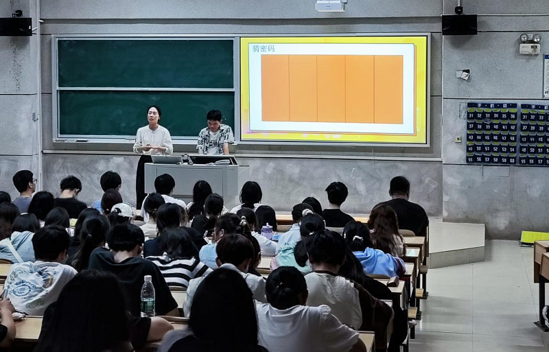 袁莎邀请我院大三密码班的学生现身说法,以“猜数字”游戏入题,帮助与会学生了解密码的概念,阐述了国家对密码行业的政策支撑和行业薪资报酬,重点介绍了密码班学生的实习情况。